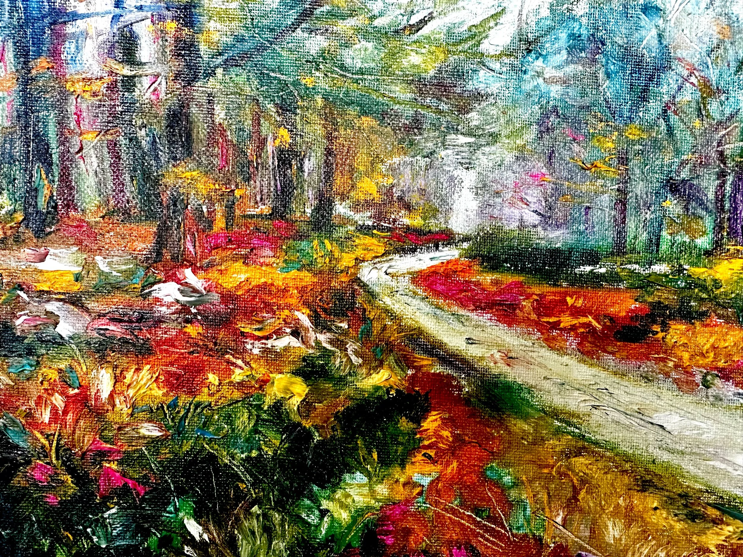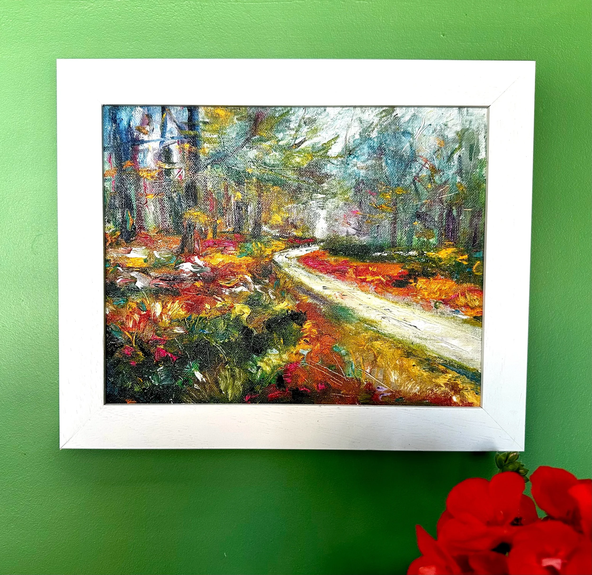 The painting is rooted in a love of walking and discovery—of paths leading somewhere unknown yet comforting. It carries a feeling of movement, stillness, and reflection all at once.