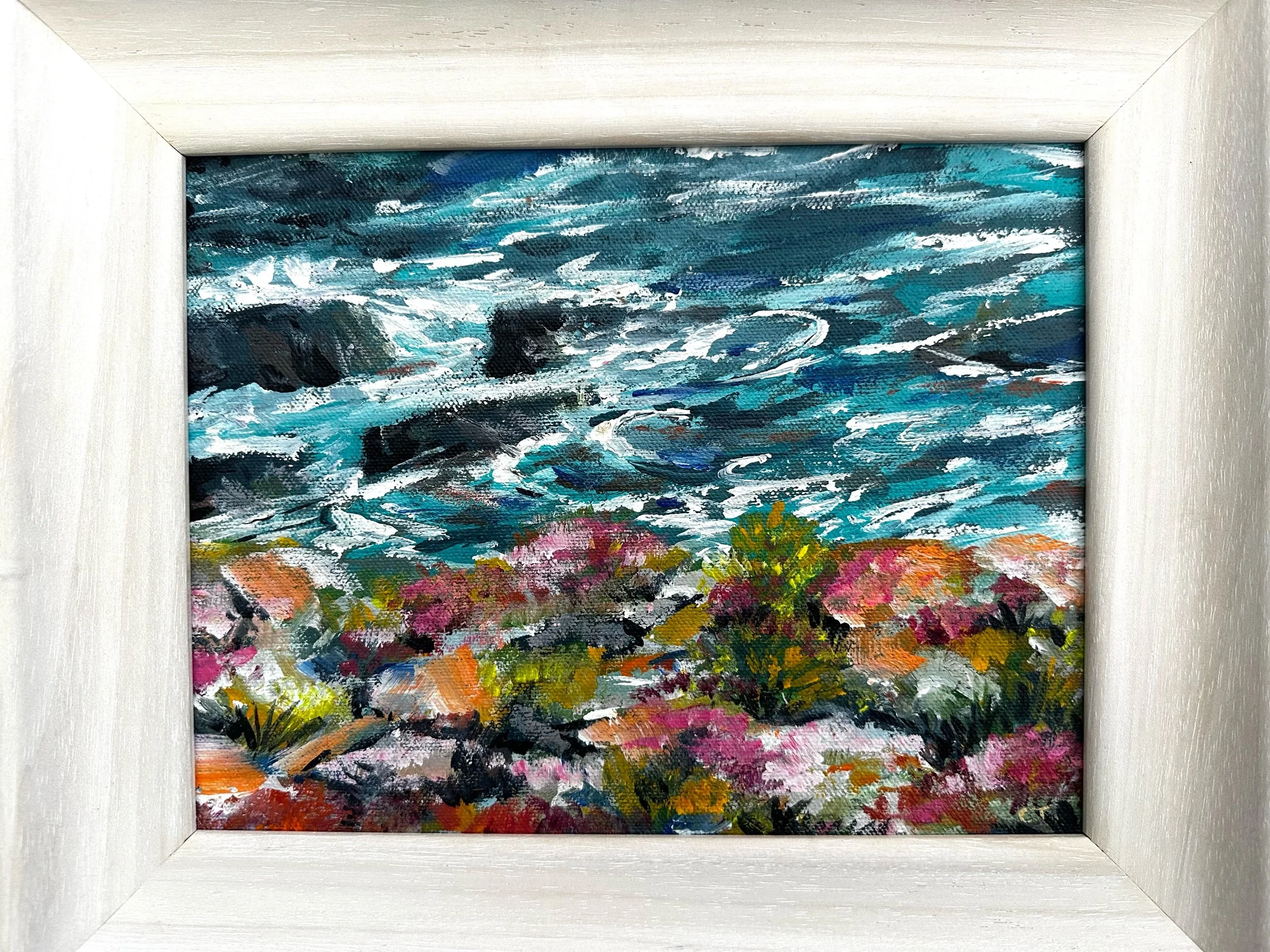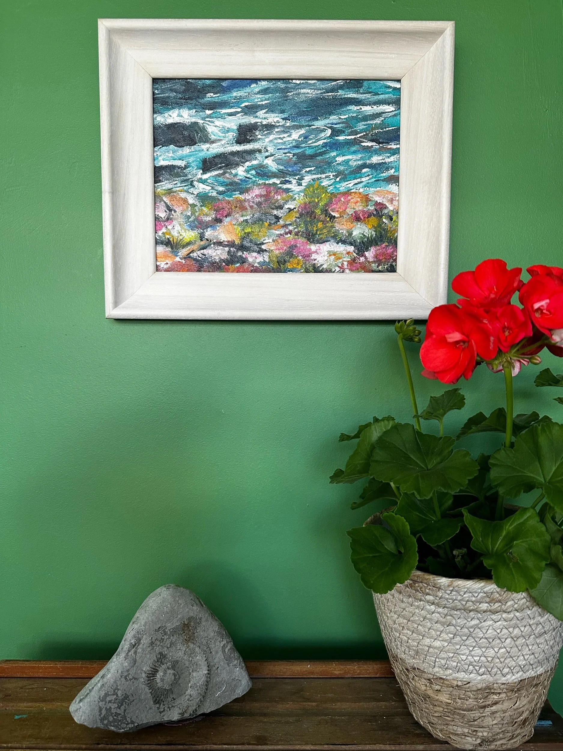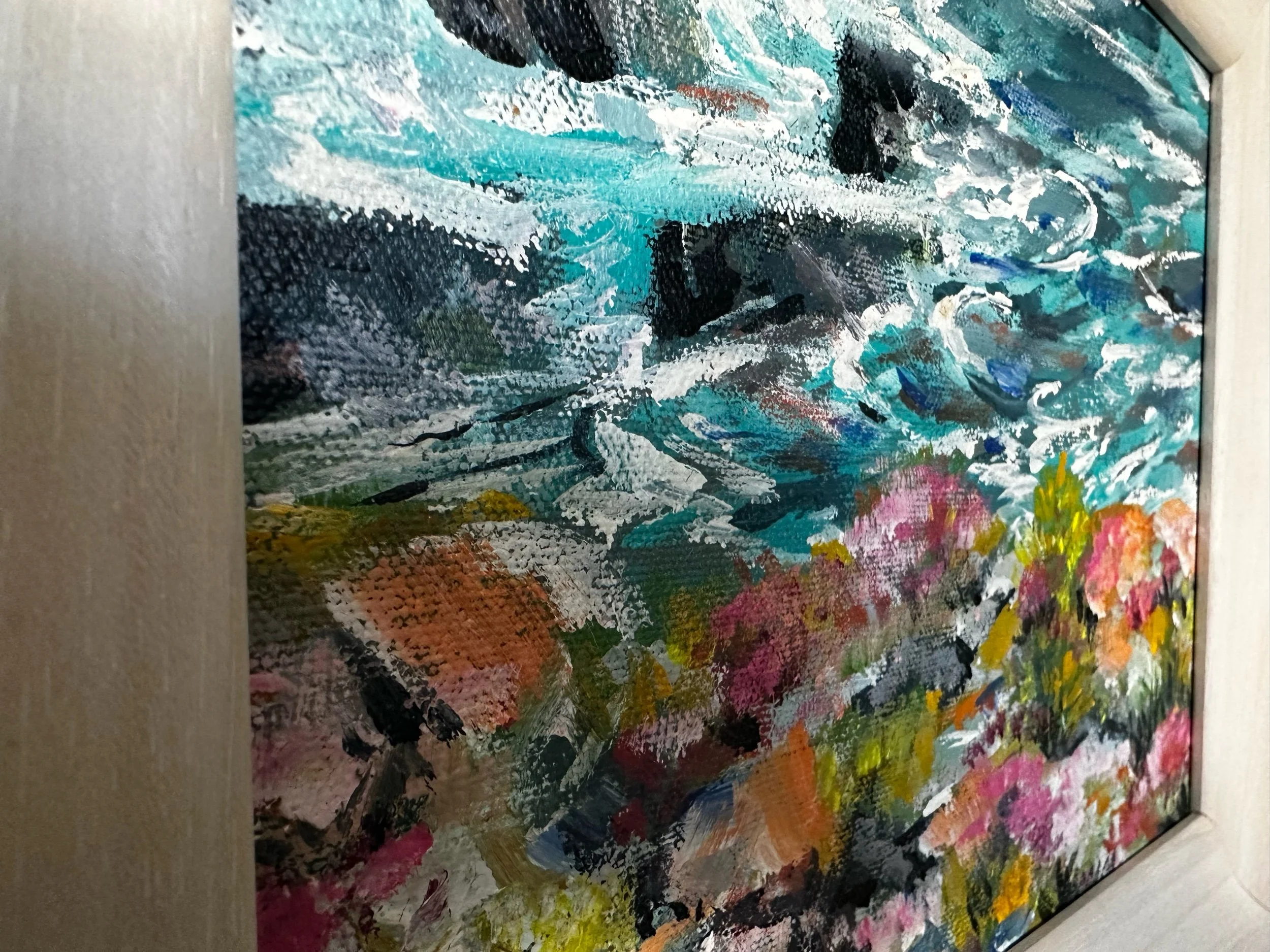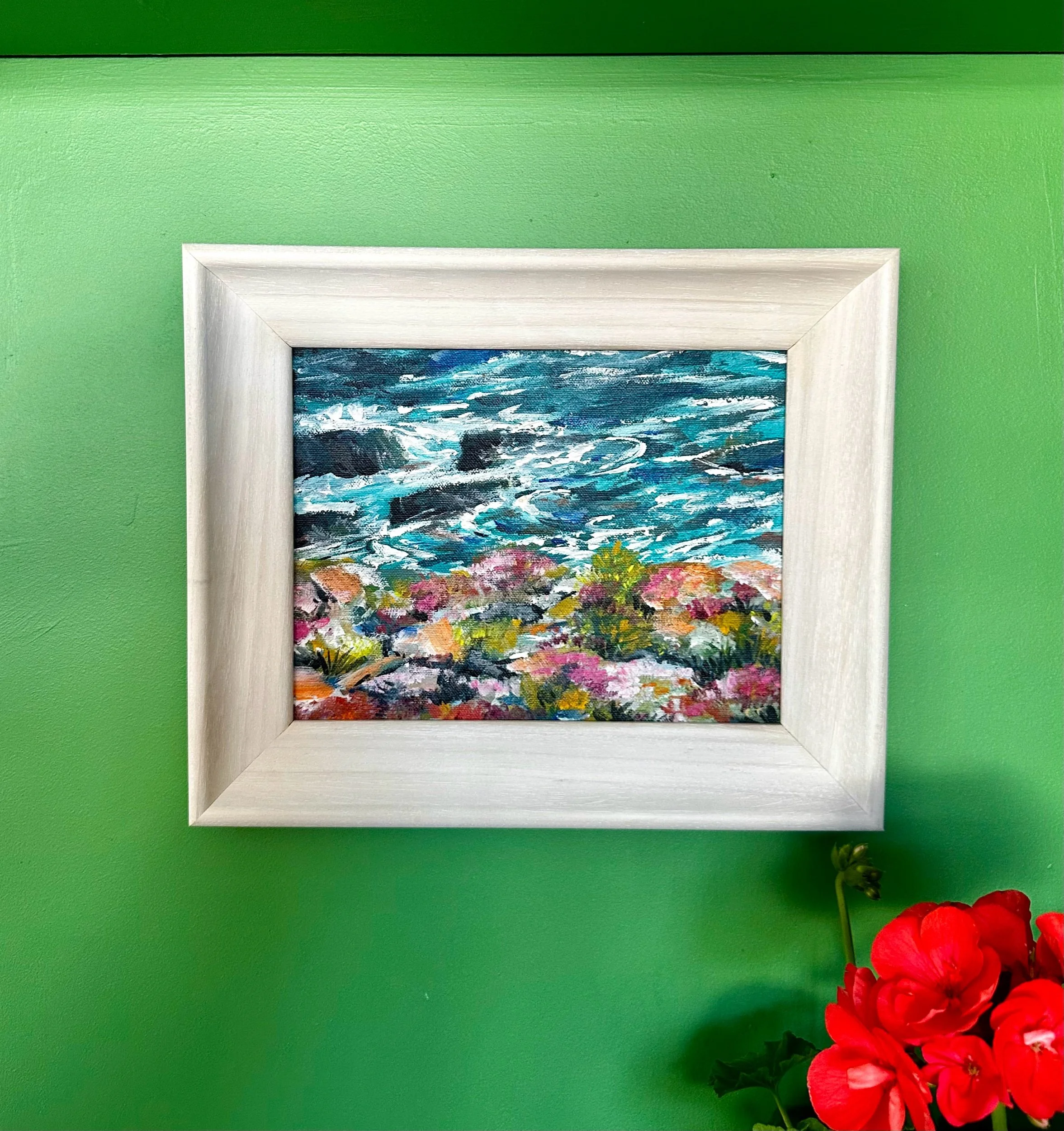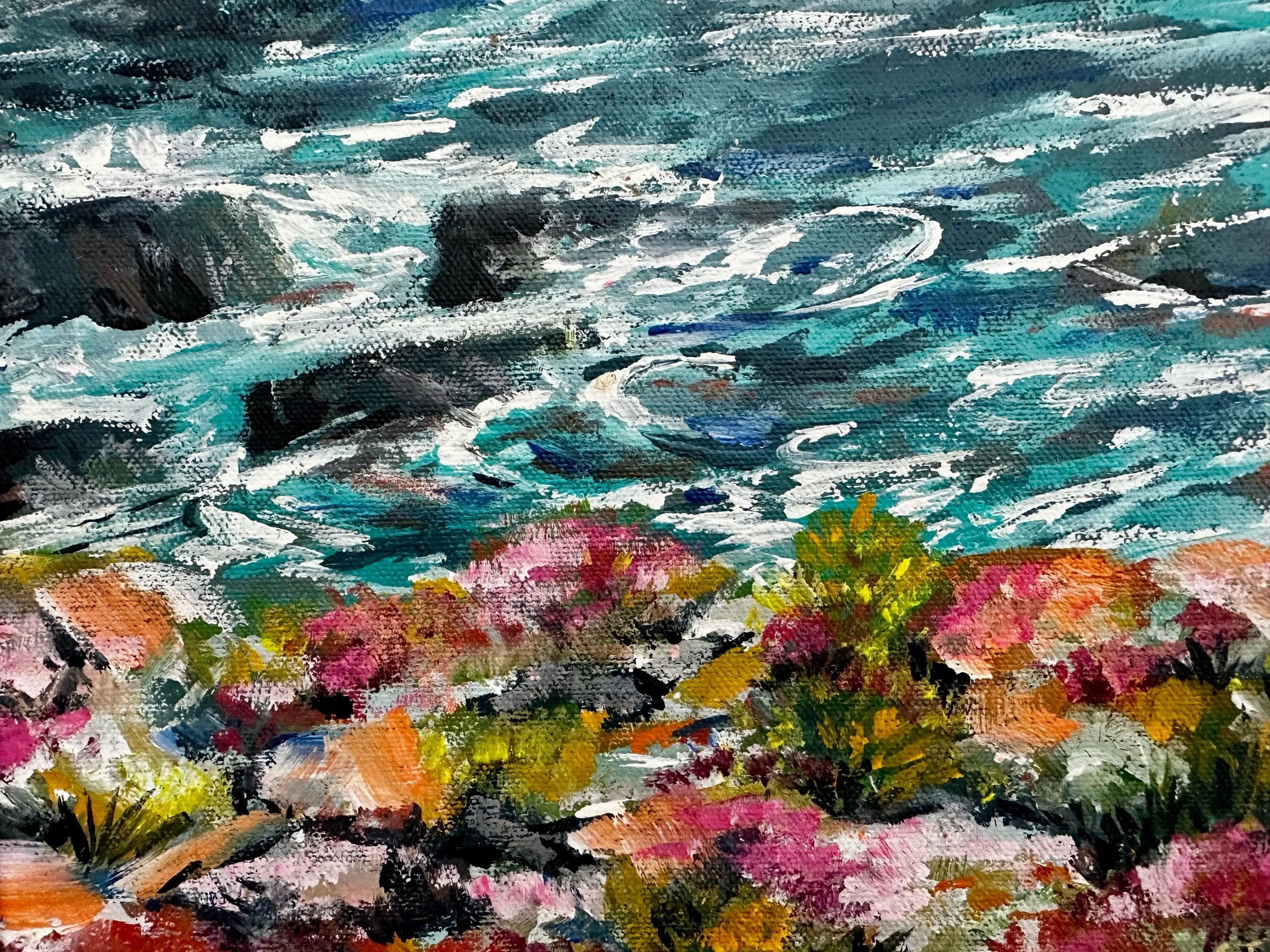 Sea thrift clings to the rocky foreground, painted in soft pinks and warm orange tones that contrast against the deep turquoise sea—my signature colour. The water is expressive and slightly abstract, capturing movement rather than a fixed moment, while the rocks anchor the composition with strength and texture.