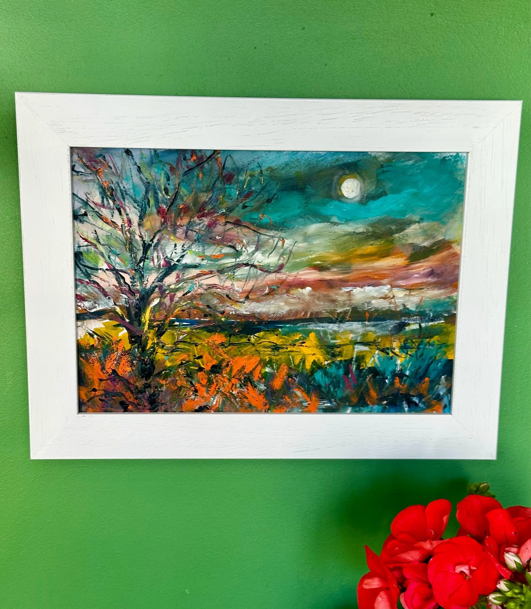 Oil on canvas, professionally framed in a white wooden frame and ready to hang.