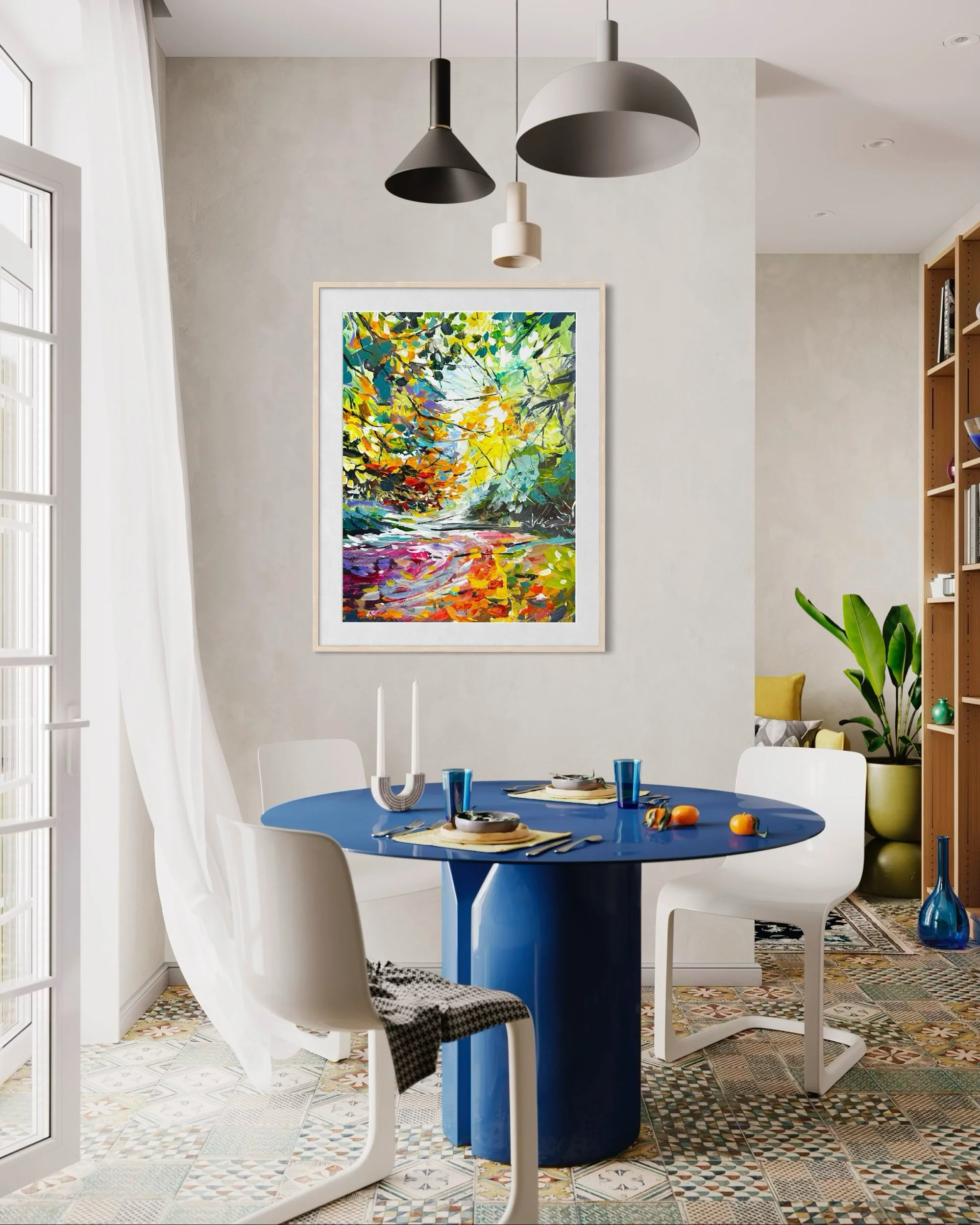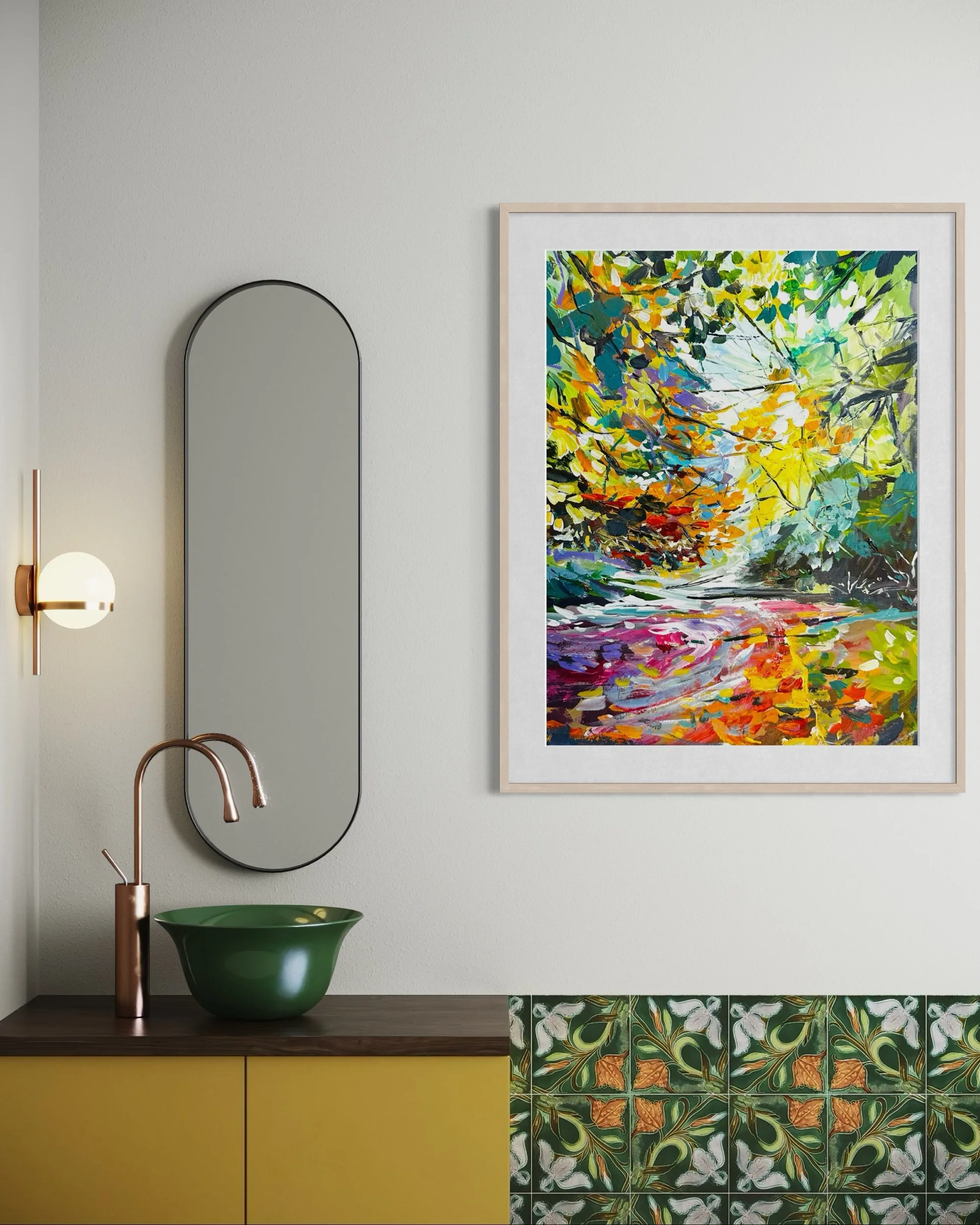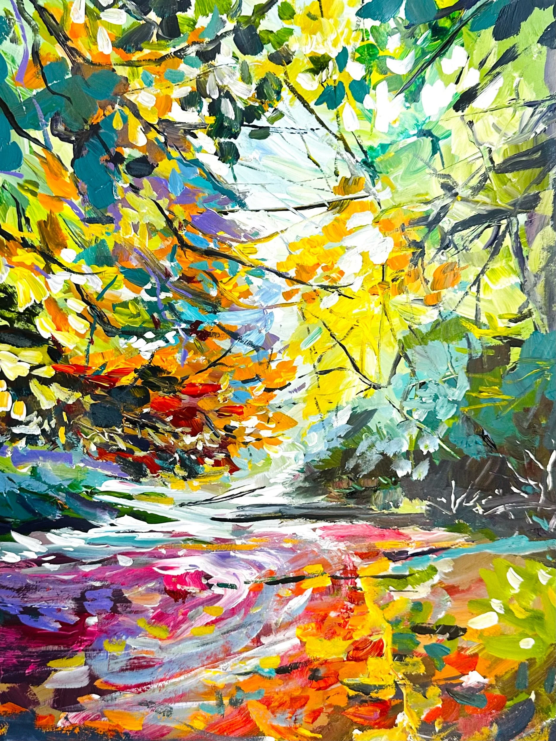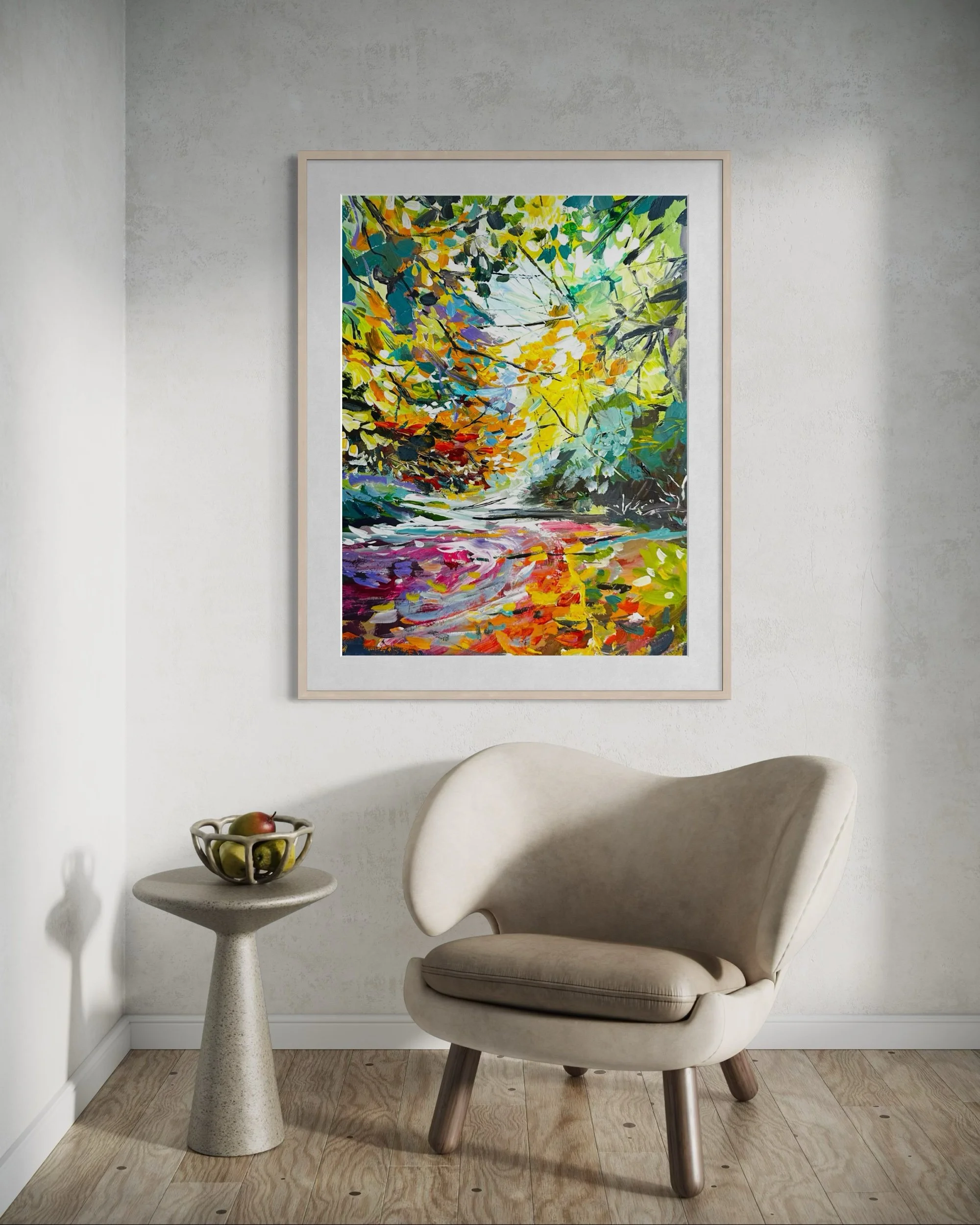 Feel uplifted every time you look at this colourful painting. Bring nature into your home and be reminded of the happiness of a country walk through a forest, sweeping your feet through the Autumn leaves.